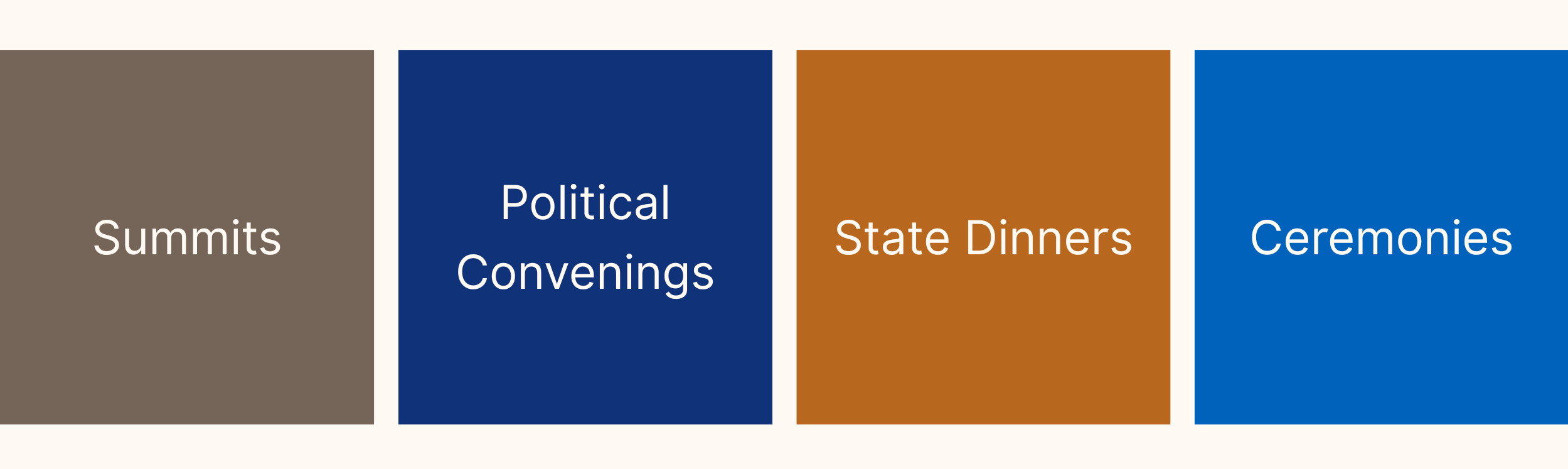 State Dinners: Prestigious occasions requiring flawless protocol, cultural sensitivity, and elevated production design.